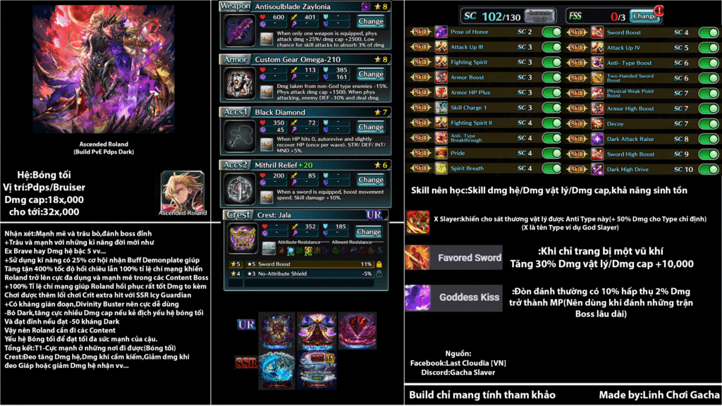 Để phát huy tối đa sức mạnh của Ascended Roland, người chơi nên tập trung vào việc trang bị các đồ vật như vũ khí, áo giáp, và phụ kiện giúp tăng từ sát thương, hồi HP/MP, đến giảm sát thương vật lý. Kết hợp với crest Jala (UR) và kỹ năng favored sword, Roland sẽ tăng cường đáng kể sát thương của bạn trong mọi trận đấu.